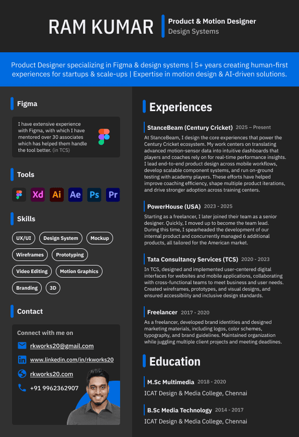 I had the pleasure of working with Ram for nearly two years, and I can confidently say he's an exceptional UI/UX designer. He brings a sharp eye for design, a deep understanding of user experience, and consistently delivers high-quality work. Ram is not just skilled, he's reliable, thoughtful, and a true team player. I strongly recommend him for any design-driven role.