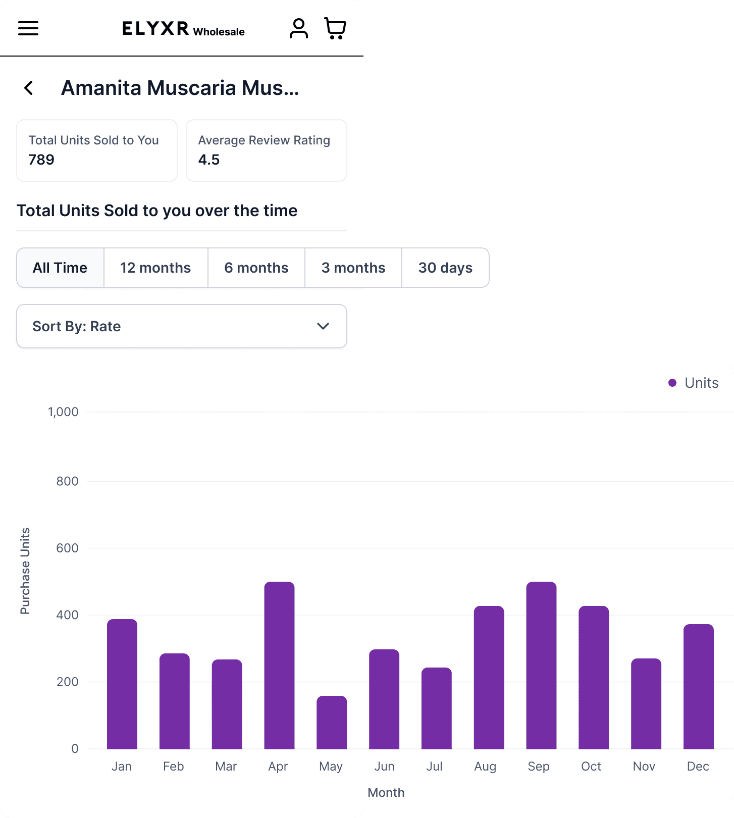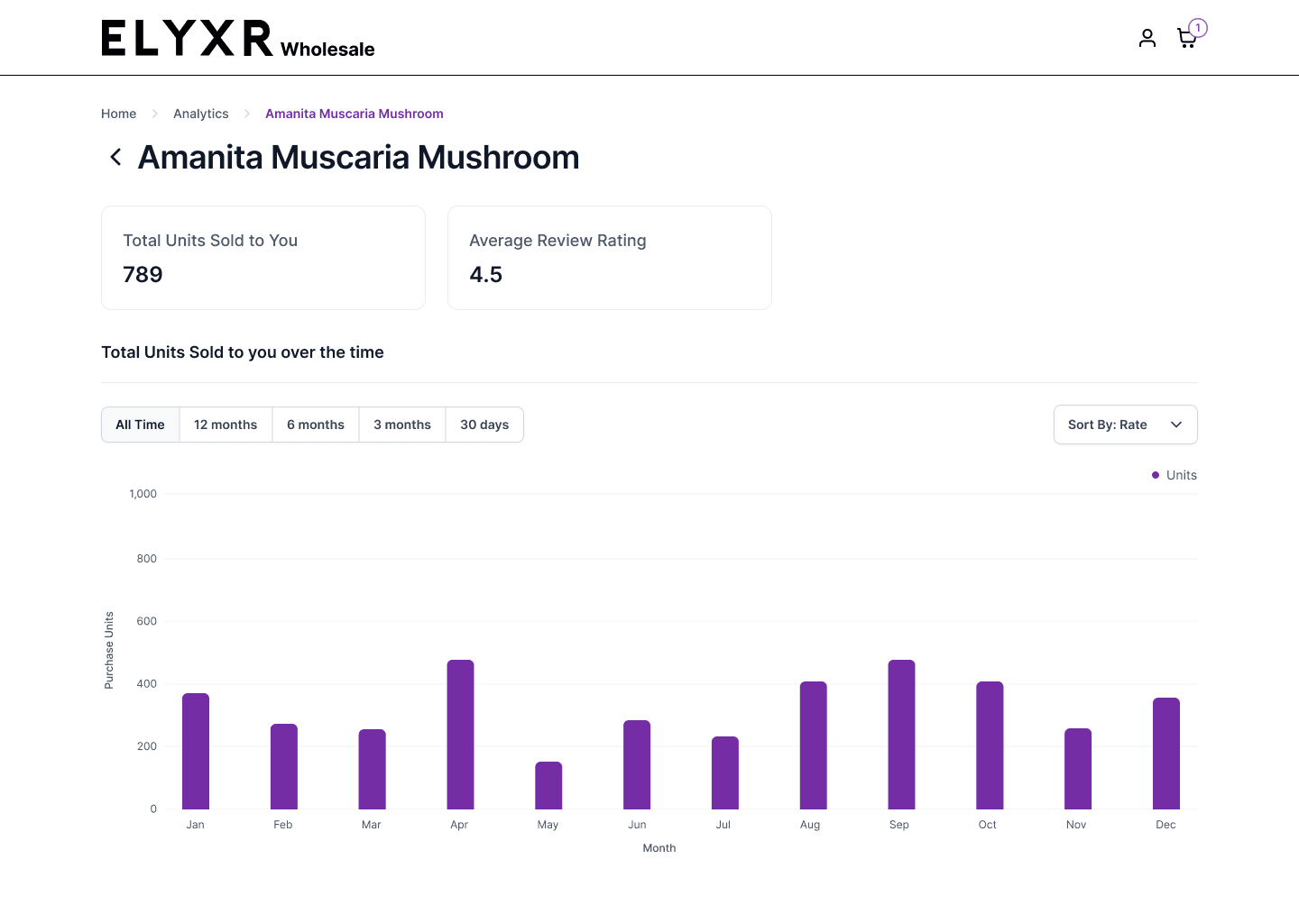 Sales Performance Tracking: The screen provides detailed insights into the sales performance of the Amanita Muscaria Mushroom. Users can see the total units sold to them (789 units) and the average review rating (4.5), offering a quick overview of both sales volume and customer satisfaction.