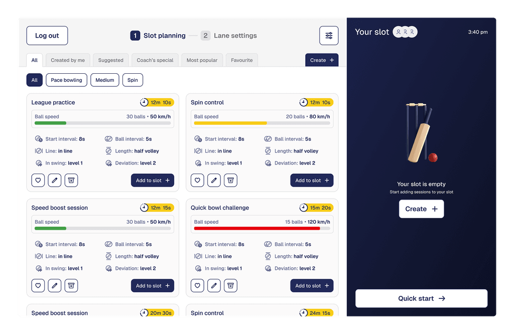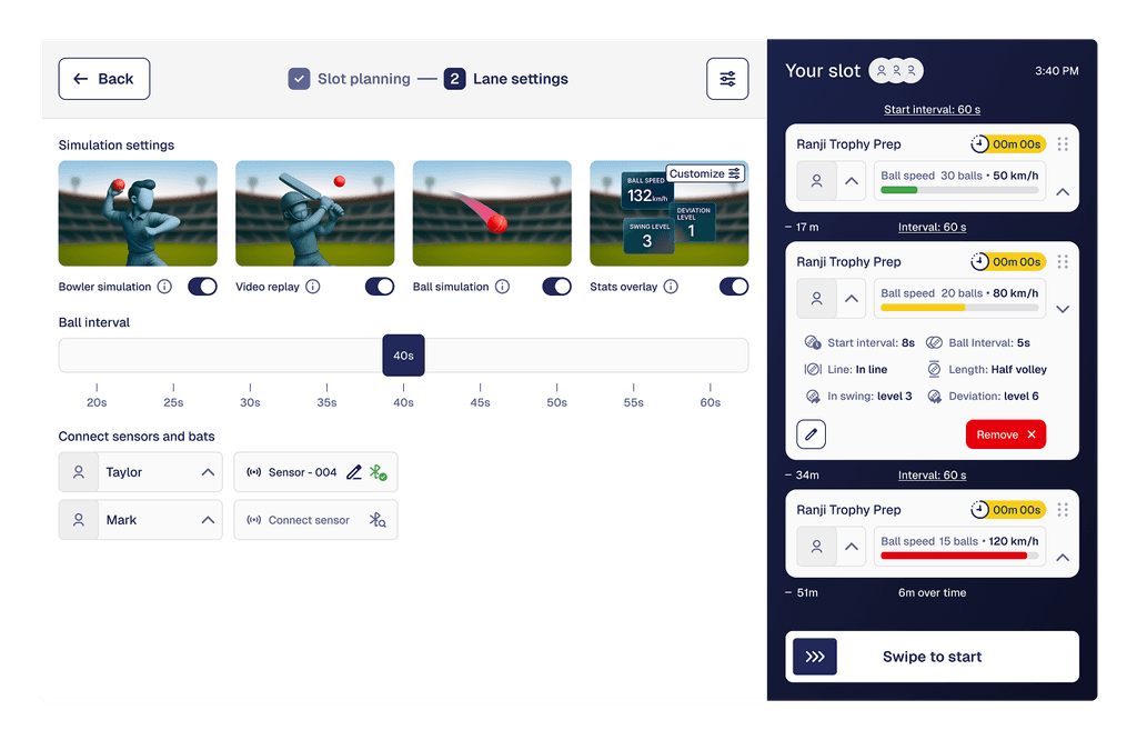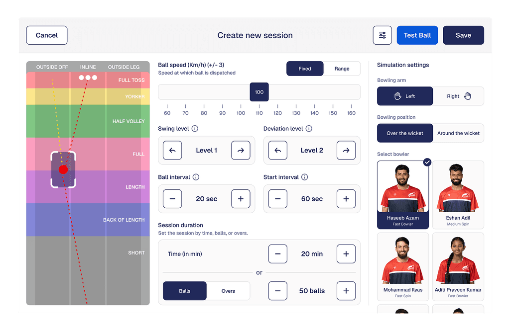 Controls: Enables precise control of the bowling machine, including speed, line, length, swing, and session structure.