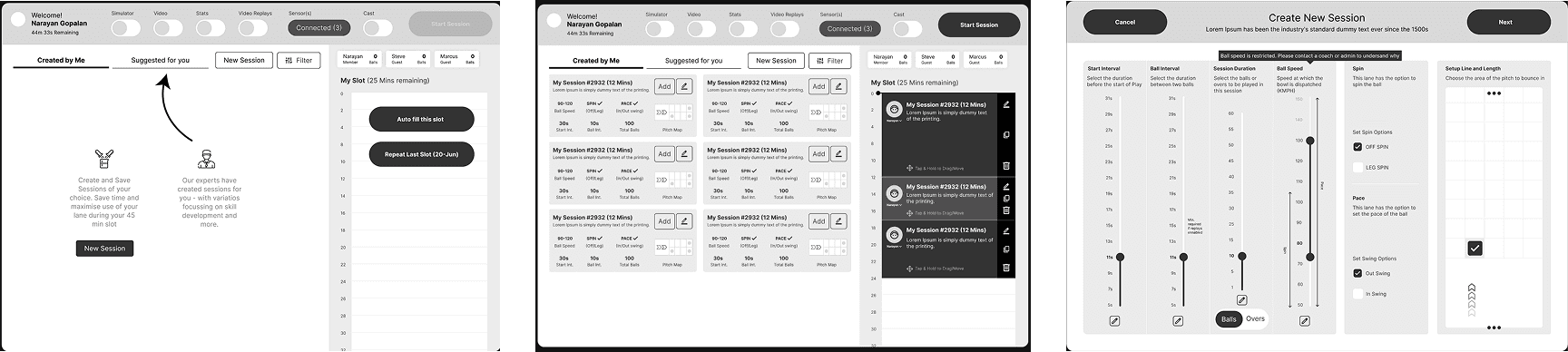 These wireframes show how I explored in-lane flows such as session start, player switching, and live feedback. The focus was on visibility, minimal interaction, and keeping attention on the game rather than the screen.