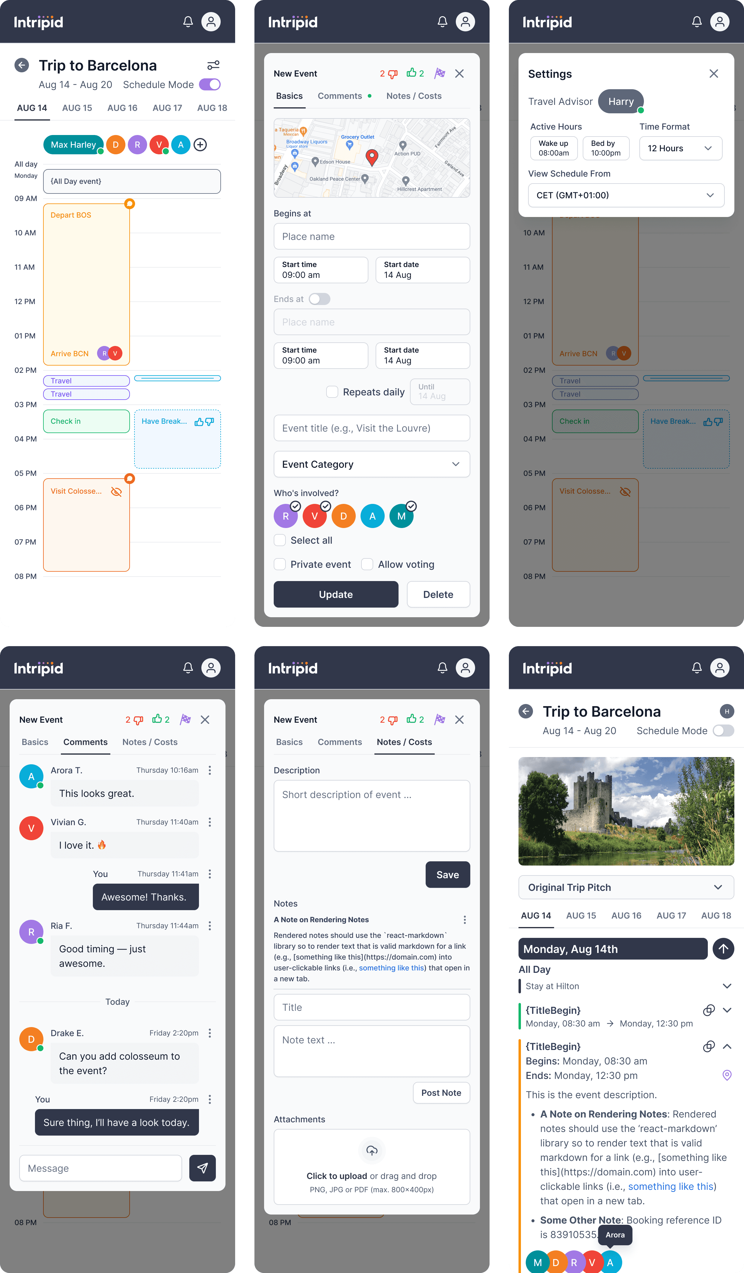 This UI provides a comprehensive overview of the trip's schedule, event details, and traveler involvement, along with interactive elements for editing or customizing each event.