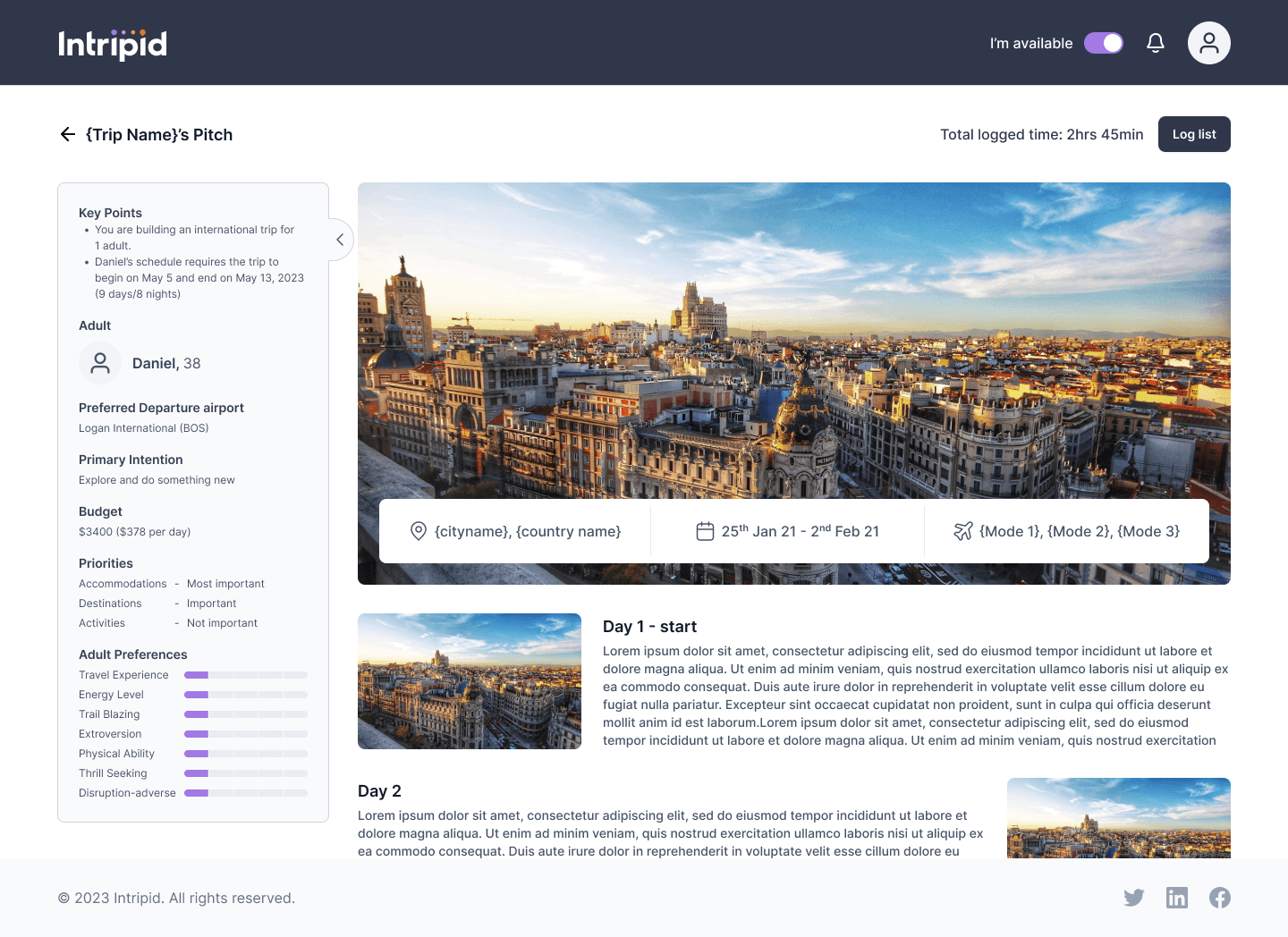This interface is to display the critical trip information for the travel advisor, the advisor can edit the basic information of the traveler over here and craft the trip itinerary by updating the information of each step.
